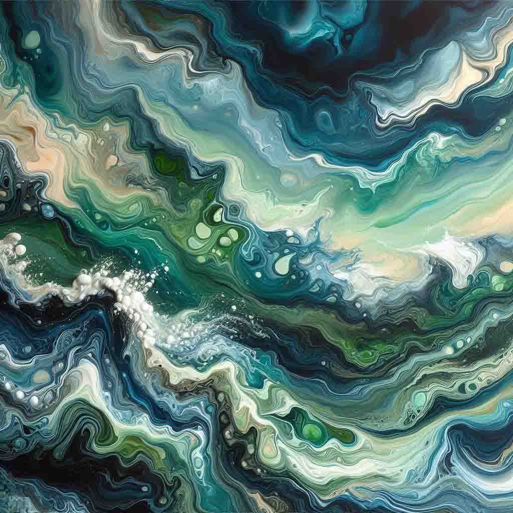 • 《海洋之歌》:這幅作品以綠色和藍色的流動顏料描繪出海洋的波濤洶湧,讓人感受到大海的磅礴氣勢。