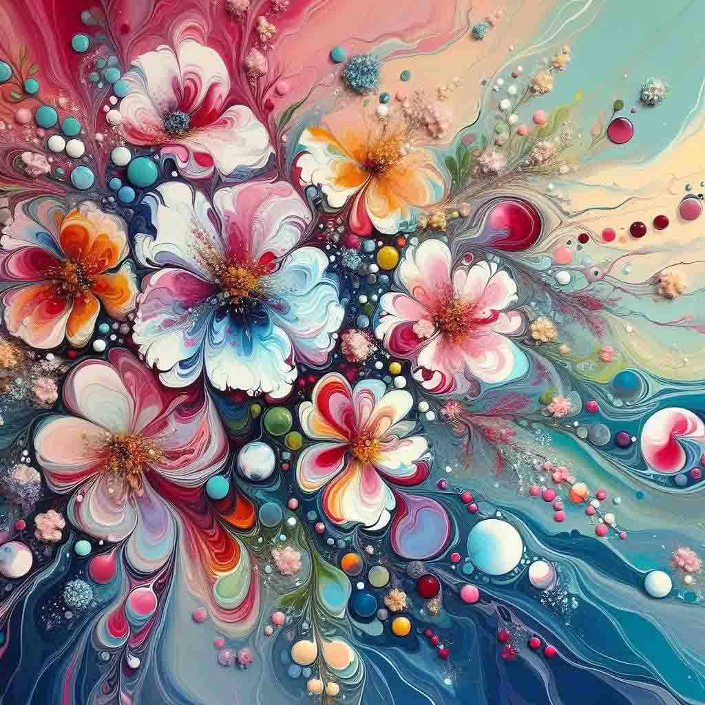 • 《花開滿園》:這幅作品以五彩繽紛的流動顏料描繪出百花盛開的景象,讓人感受到春天的生機勃勃。